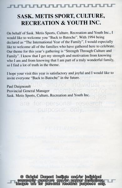 This series of images is a scan of the 1994 Back to Batoche Days program produced by Métis Nation of Saskatchewan. This item was donated to the Institute by Dennis and Jean Fisher in 2011. This collection contains archaeological artifacts taken from the battlefields of the 1885 Resistance as well as Fort Pitt (Saskatchewan), Cumberland House (Saskatchewan) and St. Peter’s Mission, Montana. The collection also includes various artifacts and ephemera relating to the 1885 Resistance and Gabriel Dumont. |