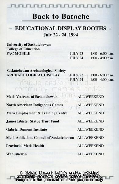 This series of images is a scan of the 1994 Back to Batoche Days program produced by Métis Nation of Saskatchewan. This item was donated to the Institute by Dennis and Jean Fisher in 2011. This collection contains archaeological artifacts taken from the battlefields of the 1885 Resistance as well as Fort Pitt (Saskatchewan), Cumberland House (Saskatchewan) and St. Peter’s Mission, Montana. The collection also includes various artifacts and ephemera relating to the 1885 Resistance and Gabriel Dumont. |