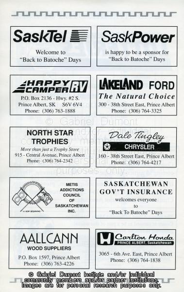 This series of images is a scan of the 1994 Back to Batoche Days program produced by Métis Nation of Saskatchewan. This item was donated to the Institute by Dennis and Jean Fisher in 2011. This collection contains archaeological artifacts taken from the battlefields of the 1885 Resistance as well as Fort Pitt (Saskatchewan), Cumberland House (Saskatchewan) and St. Peter’s Mission, Montana. The collection also includes various artifacts and ephemera relating to the 1885 Resistance and Gabriel Dumont. |