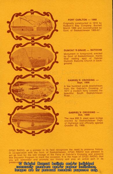 This series of images is a scan of an October 23, 1968 CFQC program for the closing of the ferry at Gabriel's Crossing (Rosthern-Batoche, Saskatchewan) and the opening of the Gabriel (Dumont) Bridge. This item was donated to the Institute by Dennis and Jean Fisher in 2011. This collection contains archaeological artifacts taken from the battlefields of the 1885 Resistance as well as Fort Pitt (Saskatchewan), Cumberland House (Saskatchewan) and St. Peter's Mission, Montana. The collection also includes various artifacts and ephemera relating to the 1885 Resistance and Gabriel Dumont. |