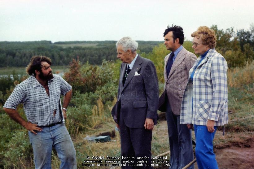 Description: This series of photographs was taken by Dennis Fisher in August 1977 and focuses on the visit of the former Prime Minister of Canada, the Right Honourable John G. Diefenbaker and MP Ray Hnatyshyn (later the Governor General) to an archaeological dig at Batoche. The following were the main people present in the photographs: John Diefenbaker (grey suit with white hanky, shirt and tie), Ray Hnatyshyn (light grey jacket, blue shirt), Paul F. Donahue, archaeologist (pink shirt, black pants), Valerie J. Hall, archaeologist (dark hair, blue zippered jacket), Mable Simpson, Parks Canada employee (blue slacks, checked jacket), Terry ?, Parks Canada archaeologist (beard, checked shirt), Wild Weber and Gary Von Kuster (newsmen and TV photographer) and and Edward Bruce, Parks Canada, Batoche Custodian (brown suit). This collection contains archaeological artifacts taken from the battlefields of the 1885 Resistance as well as Fort Pitt (Saskatchewan), Cumberland House (Saskatchewan) and St. Peter’s Mission, Montana. The collection also includes various artifacts and ephemera relating to the 1885 Resistance and Gabriel Dumont.