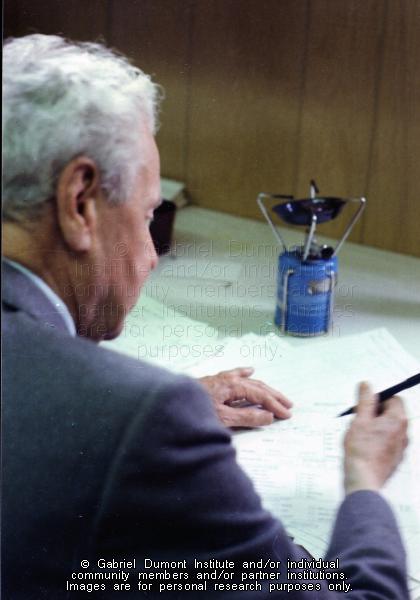 Description: This series of photographs was taken by Dennis Fisher in August 1977 and focuses on the visit of the former Prime Minister of Canada, the Right Honourable John G. Diefenbaker and MP Ray Hnatyshyn (later the Governor General) to an archaeological dig at Batoche. The following were the main people present in the photographs: John Diefenbaker (grey suit with white hanky, shirt and tie), Ray Hnatyshyn (light grey jacket, blue shirt), Paul F. Donahue, archaeologist (pink shirt, black pants), Valerie J. Hall, archaeologist (dark hair, blue zippered jacket), Mable Simpson, Parks Canada employee (blue slacks, checked jacket), Terry ?, Parks Canada archaeologist (beard, checked shirt), Wild Weber and Gary Von Kuster (newsmen and TV photographer) and and Edward Bruce, Parks Canada, Batoche Custodian (brown suit). This collection contains archaeological artifacts taken from the battlefields of the 1885 Resistance as well as Fort Pitt (Saskatchewan), Cumberland House (Saskatchewan) and St. Peter’s Mission, Montana. The collection also includes various artifacts and ephemera relating to the 1885 Resistance and Gabriel Dumont.