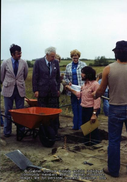 Description: This series of photographs was taken by Dennis Fisher in August 1977 and focuses on the visit of the former Prime Minister of Canada, the Right Honourable John G. Diefenbaker and MP Ray Hnatyshyn (later the Governor General) to an archaeological dig at Batoche. The following were the main people present in the photographs: John Diefenbaker (grey suit with white hanky, shirt and tie), Ray Hnatyshyn (light grey jacket, blue shirt), Paul F. Donahue, archaeologist (pink shirt, black pants), Valerie J. Hall, archaeologist (dark hair, blue zippered jacket), Mable Simpson, Parks Canada employee (blue slacks, checked jacket), Terry ?, Parks Canada archaeologist (beard, checked shirt), Wild Weber and Gary Von Kuster (newsmen and TV photographer) and and Edward Bruce, Parks Canada, Batoche Custodian (brown suit). This collection contains archaeological artifacts taken from the battlefields of the 1885 Resistance as well as Fort Pitt (Saskatchewan), Cumberland House (Saskatchewan) and St. Peter’s Mission, Montana. The collection also includes various artifacts and ephemera relating to the 1885 Resistance and Gabriel Dumont.