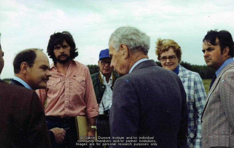 Description: This series of photographs was taken by Dennis Fisher in August 1977 and focuses on the visit of the former Prime Minister of Canada, the Right Honourable John G. Diefenbaker and MP Ray Hnatyshyn (later the Governor General) to an archaeological dig at Batoche. The following were the main people present in the photographs: John Diefenbaker (grey suit with white hanky, shirt and tie), Ray Hnatyshyn (light grey jacket, blue shirt), Paul F. Donahue, archaeologist (pink shirt, black pants), Valerie J. Hall, archaeologist (dark hair, blue zippered jacket), Mable Simpson, Parks Canada employee (blue slacks, checked jacket), Terry ?, Parks Canada archaeologist (beard, checked shirt), Wild Weber and Gary Von Kuster (newsmen and TV photographer) and and Edward Bruce, Parks Canada, Batoche Custodian (brown suit). This collection contains archaeological artifacts taken from the battlefields of the 1885 Resistance as well as Fort Pitt (Saskatchewan), Cumberland House (Saskatchewan) and St. Peter’s Mission, Montana. The collection also includes various artifacts and ephemera relating to the 1885 Resistance and Gabriel Dumont.