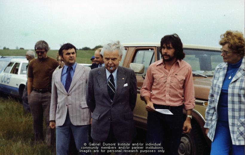 Description: This series of photographs was taken by Dennis Fisher in August 1977 and focuses on the visit of the former Prime Minister of Canada, the Right Honourable John G. Diefenbaker and MP Ray Hnatyshyn (later the Governor General) to an archaeological dig at Batoche. The following were the main people present in the photographs: John Diefenbaker (grey suit with white hanky, shirt and tie), Ray Hnatyshyn (light grey jacket, blue shirt), Paul F. Donahue, archaeologist (pink shirt, black pants), Valerie J. Hall, archaeologist (dark hair, blue zippered jacket), Mable Simpson, Parks Canada employee (blue slacks, checked jacket), Terry ?, Parks Canada archaeologist (beard, checked shirt), Wild Weber and Gary Von Kuster (newsmen and TV photographer) and and Edward Bruce, Parks Canada, Batoche Custodian (brown suit). This collection contains archaeological artifacts taken from the battlefields of the 1885 Resistance as well as Fort Pitt (Saskatchewan), Cumberland House (Saskatchewan) and St. Peter’s Mission, Montana. The collection also includes various artifacts and ephemera relating to the 1885 Resistance and Gabriel Dumont.