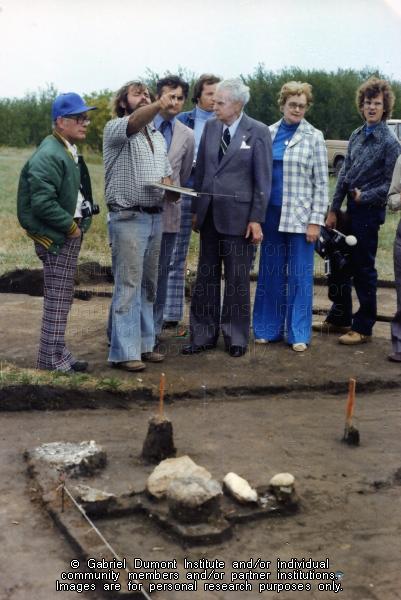 Description: This series of photographs was taken by Dennis Fisher in August 1977 and focuses on the visit of the former Prime Minister of Canada, the Right Honourable John G. Diefenbaker and MP Ray Hnatyshyn (later the Governor General) to an archaeological dig at Batoche. The following were the main people present in the photographs: John Diefenbaker (grey suit with white hanky, shirt and tie), Ray Hnatyshyn (light grey jacket, blue shirt), Paul F. Donahue, archaeologist (pink shirt, black pants), Valerie J. Hall, archaeologist (dark hair, blue zippered jacket), Mable Simpson, Parks Canada employee (blue slacks, checked jacket), Terry ?, Parks Canada archaeologist (beard, checked shirt), Wild Weber and Gary Von Kuster (newsmen and TV photographer) and and Edward Bruce, Parks Canada, Batoche Custodian (brown suit). This collection contains archaeological artifacts taken from the battlefields of the 1885 Resistance as well as Fort Pitt (Saskatchewan), Cumberland House (Saskatchewan) and St. Peter’s Mission, Montana. The collection also includes various artifacts and ephemera relating to the 1885 Resistance and Gabriel Dumont.