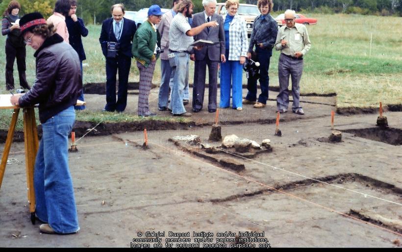 Description: This series of photographs was taken by Dennis Fisher in August 1977 and focuses on the visit of the former Prime Minister of Canada, the Right Honourable John G. Diefenbaker and MP Ray Hnatyshyn (later the Governor General) to an archaeological dig at Batoche. The following were the main people present in the photographs: John Diefenbaker (grey suit with white hanky, shirt and tie), Ray Hnatyshyn (light grey jacket, blue shirt), Paul F. Donahue, archaeologist (pink shirt, black pants), Valerie J. Hall, archaeologist (dark hair, blue zippered jacket), Mable Simpson, Parks Canada employee (blue slacks, checked jacket), Terry ?, Parks Canada archaeologist (beard, checked shirt), Wild Weber and Gary Von Kuster (newsmen and TV photographer) and and Edward Bruce, Parks Canada, Batoche Custodian (brown suit). This collection contains archaeological artifacts taken from the battlefields of the 1885 Resistance as well as Fort Pitt (Saskatchewan), Cumberland House (Saskatchewan) and St. Peter’s Mission, Montana. The collection also includes various artifacts and ephemera relating to the 1885 Resistance and Gabriel Dumont.