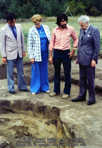 Description: This series of photographs was taken by Dennis Fisher in August 1977 and focuses on the visit of the former Prime Minister of Canada, the Right Honourable John G. Diefenbaker and MP Ray Hnatyshyn (later the Governor General) to an archaeological dig at Batoche. The following were the main people present in the photographs: John Diefenbaker (grey suit with white hanky, shirt and tie), Ray Hnatyshyn (light grey jacket, blue shirt), Paul F. Donahue, archaeologist (pink shirt, black pants), Valerie J. Hall, archaeologist (dark hair, blue zippered jacket), Mable Simpson, Parks Canada employee (blue slacks, checked jacket), Terry ?, Parks Canada archaeologist (beard, checked shirt), Wild Weber and Gary Von Kuster (newsmen and TV photographer) and and Edward Bruce, Parks Canada, Batoche Custodian (brown suit). This collection contains archaeological artifacts taken from the battlefields of the 1885 Resistance as well as Fort Pitt (Saskatchewan), Cumberland House (Saskatchewan) and St. Peter’s Mission, Montana. The collection also includes various artifacts and ephemera relating to the 1885 Resistance and Gabriel Dumont.