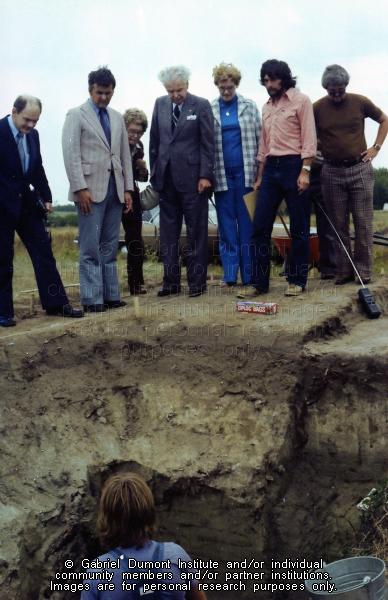 Description: This series of photographs was taken by Dennis Fisher in August 1977 and focuses on the visit of the former Prime Minister of Canada, the Right Honourable John G. Diefenbaker and MP Ray Hnatyshyn (later the Governor General) to an archaeological dig at Batoche. The following were the main people present in the photographs: John Diefenbaker (grey suit with white hanky, shirt and tie), Ray Hnatyshyn (light grey jacket, blue shirt), Paul F. Donahue, archaeologist (pink shirt, black pants), Valerie J. Hall, archaeologist (dark hair, blue zippered jacket), Mable Simpson, Parks Canada employee (blue slacks, checked jacket), Terry ?, Parks Canada archaeologist (beard, checked shirt), Wild Weber and Gary Von Kuster (newsmen and TV photographer) and and Edward Bruce, Parks Canada, Batoche Custodian (brown suit). This collection contains archaeological artifacts taken from the battlefields of the 1885 Resistance as well as Fort Pitt (Saskatchewan), Cumberland House (Saskatchewan) and St. Peter’s Mission, Montana. The collection also includes various artifacts and ephemera relating to the 1885 Resistance and Gabriel Dumont.