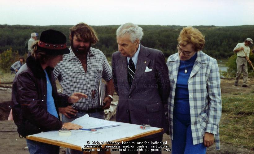 Description: This series of photographs was taken by Dennis Fisher in August 1977 and focuses on the visit of the former Prime Minister of Canada, the Right Honourable John G. Diefenbaker and MP Ray Hnatyshyn (later the Governor General) to an archaeological dig at Batoche. The following were the main people present in the photographs: John Diefenbaker (grey suit with white hanky, shirt and tie), Ray Hnatyshyn (light grey jacket, blue shirt), Paul F. Donahue, archaeologist (pink shirt, black pants), Valerie J. Hall, archaeologist (dark hair, blue zippered jacket), Mable Simpson, Parks Canada employee (blue slacks, checked jacket), Terry ?, Parks Canada archaeologist (beard, checked shirt), Wild Weber and Gary Von Kuster (newsmen and TV photographer) and and Edward Bruce, Parks Canada, Batoche Custodian (brown suit). This collection contains archaeological artifacts taken from the battlefields of the 1885 Resistance as well as Fort Pitt (Saskatchewan), Cumberland House (Saskatchewan) and St. Peter’s Mission, Montana. The collection also includes various artifacts and ephemera relating to the 1885 Resistance and Gabriel Dumont.