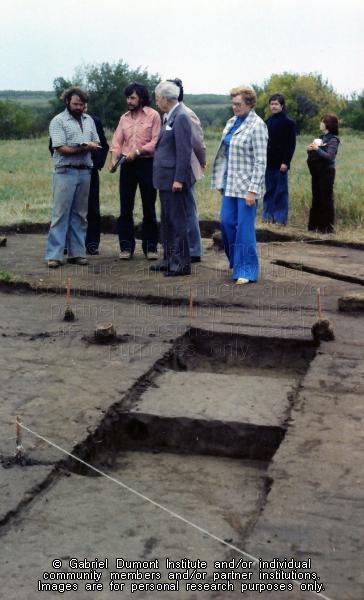 Description: This series of photographs was taken by Dennis Fisher in August 1977 and focuses on the visit of the former Prime Minister of Canada, the Right Honourable John G. Diefenbaker and MP Ray Hnatyshyn (later the Governor General) to an archaeological dig at Batoche. The following were the main people present in the photographs: John Diefenbaker (grey suit with white hanky, shirt and tie), Ray Hnatyshyn (light grey jacket, blue shirt), Paul F. Donahue, archaeologist (pink shirt, black pants), Valerie J. Hall, archaeologist (dark hair, blue zippered jacket), Mable Simpson, Parks Canada employee (blue slacks, checked jacket), Terry ?, Parks Canada archaeologist (beard, checked shirt), Wild Weber and Gary Von Kuster (newsmen and TV photographer) and and Edward Bruce, Parks Canada, Batoche Custodian (brown suit). This collection contains archaeological artifacts taken from the battlefields of the 1885 Resistance as well as Fort Pitt (Saskatchewan), Cumberland House (Saskatchewan) and St. Peter’s Mission, Montana. The collection also includes various artifacts and ephemera relating to the 1885 Resistance and Gabriel Dumont.