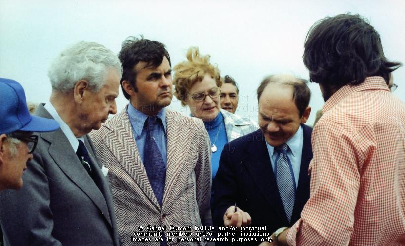 Description: This series of photographs was taken by Dennis Fisher in August 1977 and focuses on the visit of the former Prime Minister of Canada, the Right Honourable John G. Diefenbaker and MP Ray Hnatyshyn (later the Governor General) to an archaeological dig at Batoche. The following were the main people present in the photographs: John Diefenbaker (grey suit with white hanky, shirt and tie), Ray Hnatyshyn (light grey jacket, blue shirt), Paul F. Donahue, archaeologist (pink shirt, black pants), Valerie J. Hall, archaeologist (dark hair, blue zippered jacket), Mable Simpson, Parks Canada employee (blue slacks, checked jacket), Terry ?, Parks Canada archaeologist (beard, checked shirt), Wild Weber and Gary Von Kuster (newsmen and TV photographer) and and Edward Bruce, Parks Canada, Batoche Custodian (brown suit). This collection contains archaeological artifacts taken from the battlefields of the 1885 Resistance as well as Fort Pitt (Saskatchewan), Cumberland House (Saskatchewan) and St. Peter’s Mission, Montana. The collection also includes various artifacts and ephemera relating to the 1885 Resistance and Gabriel Dumont.