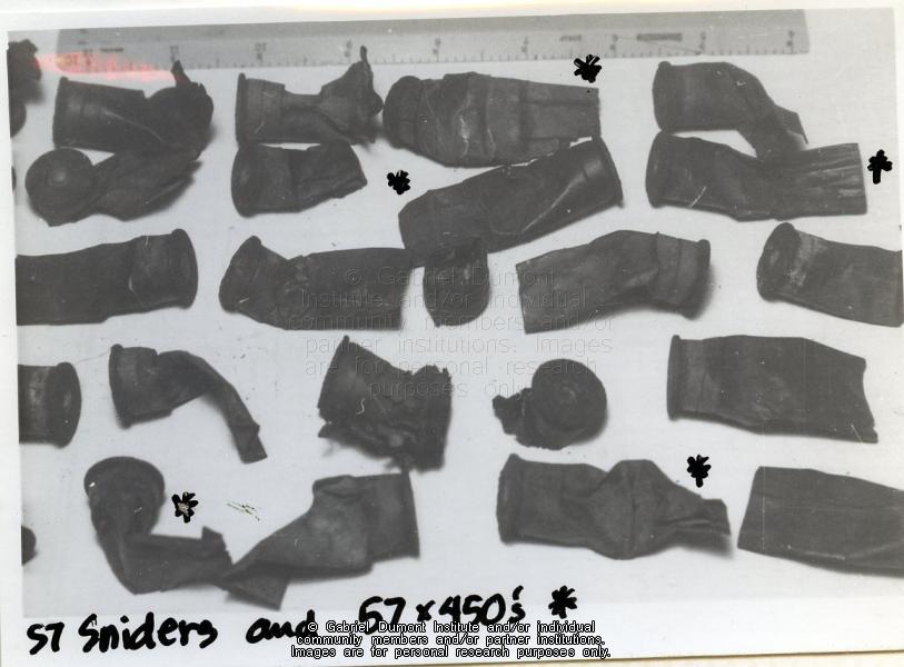 These photographs are of various artifacts, including Gatling Gun shells and Snider rifle rounds and other items found on fields at Batoche by Dennis and Jean Fisher and their sons David, Dennis Jr., and Darwin during the late 1960s and early 1970s. These items were fond before Batoche National Historical Site acquired this land. These photographs are part of the Dennis and Jean Fisher Collection. This collection contains archaeological artifacts taken from the battlefields of the 1885 Resistance as well as Fort Pitt (Saskatchewan), Cumberland House (Saskatchewan) and St. Peter’s Mission, Montana. The collection also includes various artifacts and ephemera relating to the 1885 Resistance and Gabriel Dumont. |