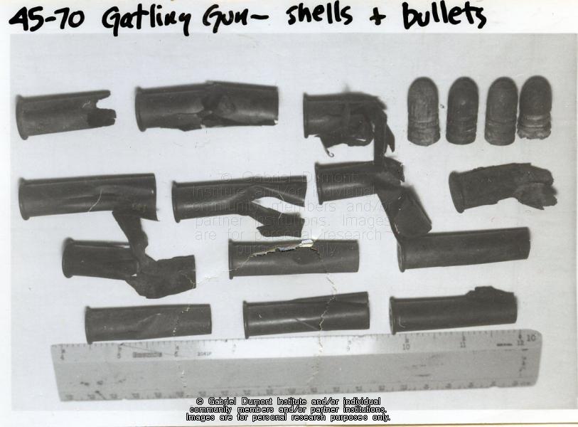 These photographs are of various artifacts, including Gatling Gun shells and Snider rifle rounds and other items found on fields at Batoche by Dennis and Jean Fisher and their sons David, Dennis Jr., and Darwin during the late 1960s and early 1970s. These items were fond before Batoche National Historical Site acquired this land. These photographs are part of the Dennis and Jean Fisher Collection. This collection contains archaeological artifacts taken from the battlefields of the 1885 Resistance as well as Fort Pitt (Saskatchewan), Cumberland House (Saskatchewan) and St. Peter’s Mission, Montana. The collection also includes various artifacts and ephemera relating to the 1885 Resistance and Gabriel Dumont. |