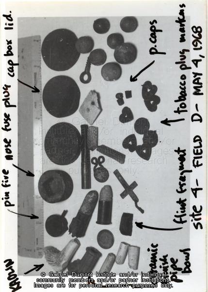 These photographs are of various artifacts, including Gatling Gun shells and Snider rifle rounds and other items found on fields at Batoche by Dennis and Jean Fisher and their sons David, Dennis Jr., and Darwin during the late 1960s and early 1970s. These items were fond before Batoche National Historical Site acquired this land. These photographs are part of the Dennis and Jean Fisher Collection. This collection contains archaeological artifacts taken from the battlefields of the 1885 Resistance as well as Fort Pitt (Saskatchewan), Cumberland House (Saskatchewan) and St. Peter’s Mission, Montana. The collection also includes various artifacts and ephemera relating to the 1885 Resistance and Gabriel Dumont. |