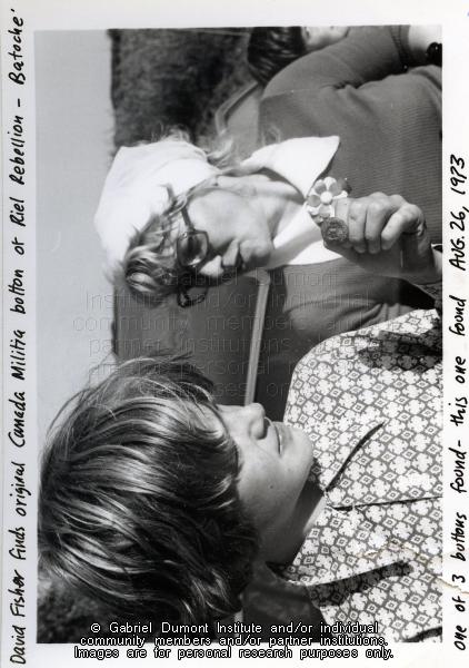 In this photograph, David Fisher (with his mother Jean looking on) shows one of three Canadian militia buttons that he found on field at Batoche on August 26, 1976. These items were fond before Batoche National Historical Site acquired this land. These photographs are part of the Dennis and Jean Fisher Collection. This collection contains archaeological artifacts taken from the battlefields of the 1885 Resistance as well as Fort Pitt (Saskatchewan), Cumberland House (Saskatchewan) and St. Peter’s Mission, Montana. The collection also includes various artifacts and ephemera relating to the 1885 Resistance and Gabriel Dumont. |