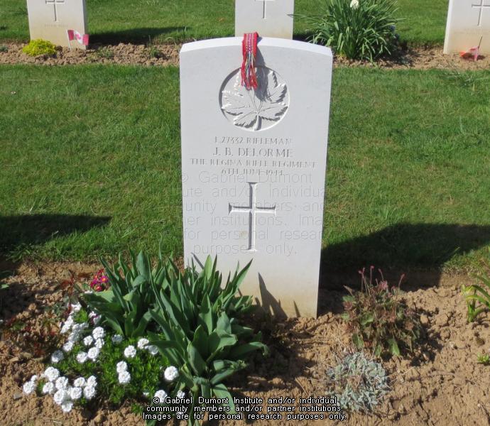 Description: Gravestone of John Baptiste Delorme, L.27332 Rifleman, The Regina Rifle Regiment. Died June 6th, 1944.