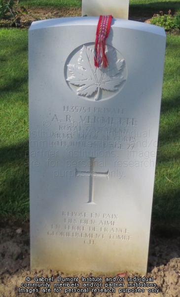 Gravestone of Antonio R. Vermette, H.35754 Private, Royal Canadian Army Medical Corps. Died June 6th, 1944. Age 27. The inscription reads, "Repose en paix fils bien aime en terre de France glorieusement tombe. C.H." Son of Antoine and Clarisse Vermette, of Ste. Rose du Lac, Manitoba. |