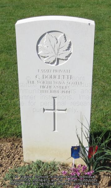 Gravestone of Charles Doucette, F.55317 Private, The North Nova Scotia Highlanders. Died June 7th, 1944. |
