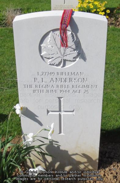 Description: Gravestone of Patrick Louie Anderson, L.27749 Rifleman, The Regina Rifle Regiment. Died June 18th, 1944. Age 25. Son of Joseph and Anna Belle Anderson, of Regina, Saskatchewan.