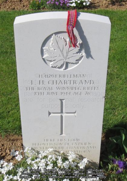 Description: Gravestone of Louis H. Chartrand, H.41294 Rifleman, The Royal Winnipeg Rifles. Died June 8th, 1944. Age 26. Inscription reads, "Here Lies Louis Beloved Son of Cyprien and Veronique Chartrand, Camperville, Manitoba.