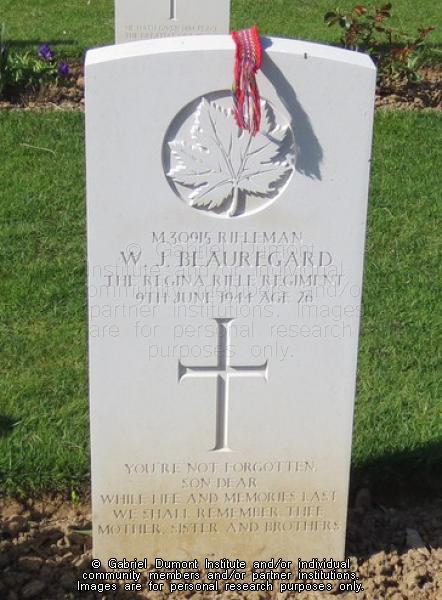 Gravestone of Wilfred Joseph Beauregard, M.30915 Rifleman, The Regina Rifle Regiment. Died June 9th, 1944. Age 26. Inscription reads, "You’re Not Forgotten, Son Dear. While Life and Memories Last We Shall Remember Thee Mother, Sister and Brothers." Son of Norbert and Margerette Beauregard, of St. Paul, Alberta. |