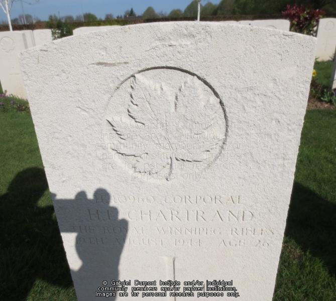 Gravestone of Harry Louis Chartrand, H.40960 Corporal, The Royal Winnipeg Rifles. Died August 19th, 1944. Age 26. Son of Gaspard Louis Chartrand and Josephine Chartrand, of Inwood, Manitoba, Canada. |