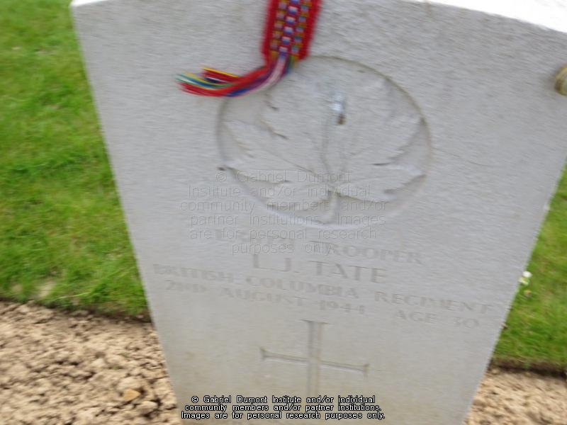 Gravestone of Leslie J. Tate, L.36731 Trooper, British Columbia Regiment. Died August 2nd, 1944. Age 30. Son of Eugenie and Marie Tate, of Macdowall, Saskatchewan. |