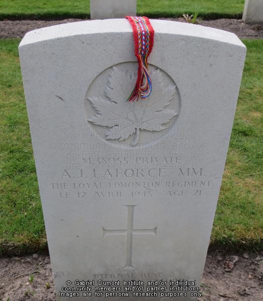 Gravestone of Alphonse Joseph Laforce, MM (Military Medal), M.38055 Private, The Loyal Edmonton Regiment. Died April 12, 1945. Age 21. Inscription reads, "Eternal Rest Give Unto Him O Lord And Let Perpetual Light Shine Upon Him." Son of Louis and Leona Laforce, of Legal, Alberta. |
