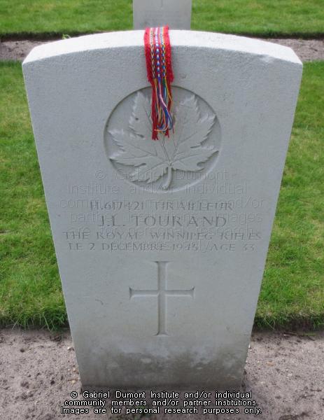 Description: Gravestone of Joseph Leo Tourand, H.617421 Tirailleur (Rifleman), The Royal Winnipeg Rifles. Died December 2nd, 1945. Age 33. Husband of Irene Tourand, of Nanaimo, British Columbia.