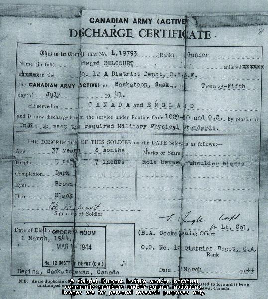 | Description: | This image is of Edward Belcourt`s discharge certificate from the Canadian Army, WWII. |