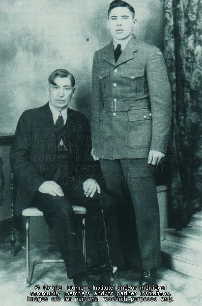 This is a photograph of Clarence Joseph Trotchie, of Saskatoon, Saskatchewan, a WWII veteran, Royal Canadian Amoured Corps, enlisted in 1941 at 17, discharged underage, reenlisted., April 23, 1942, B-85244 with his grandfather Peter Trottier. |