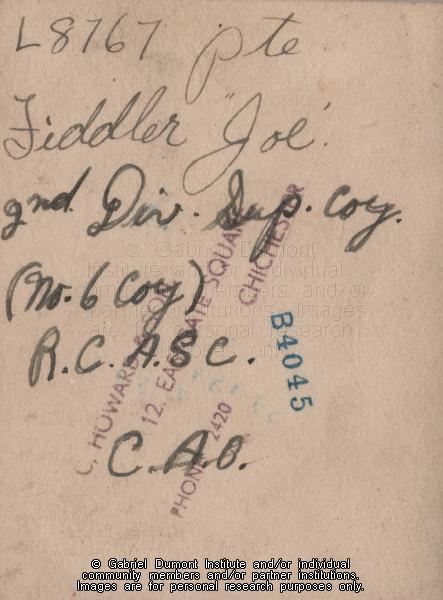 | Description: | This is the back of a photograph of Joe Fiddler, Pte.,WWII, 2nd Div. Sup. Coy., N0. 6 Coy, RCASC, L-8767. |
