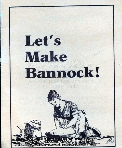 This image is the first page of a pamphlet on how to make bannock. This item was donated to the Institute by Dennis and Jean Fisher in 2013. This collection contains archaeological artifacts taken from the battlefields of the 1885 Resistance as well as Fort Pitt (Saskatchewan), Cumberland House (Saskatchewan) and St. Peter's Mission, Montana. The collection also includes various artifacts and ephemera relating to the 1885 Resistance and Gabriel Dumont.