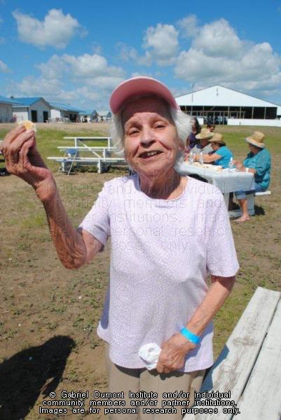 ``On Sunday July 22nd, 2012, my wife, Jeannie and I went to the Back to Batoche celebrations. Little did we know we were in for a pleasant surprise. A good friend, Senator Nora Cummings took us to meet an old friend, and that old friend would be Rose Boyer—a lady we well remember from the 1980s. How delightful to see her smiling face! Rose is battling cancer and weighs a mere 87 pounds...a feisty 87 pounds! A < Over the years, Jeannie and I have photographed Rose baking bannock. I went through some photograph albums and selected some images for the Gabriel Dumont Institute`s records. Interesting to note is Rose`s jet-black hair in the early photos. Later came the grey hair, and in August this year came the silver. I took over 70 photos of Rose making bannock during the Sunday competition. Over 25 of the photos were of Rose kneading the bannock with her knuckles. One could see she loved what she was doing, and she loved her trip to Batoche. A happy lady, she watched as her son Phil and his wife Gail, were honoured as Mr. and Mrs. Batoche, and was given the added pleasure of enjoying the fiddling prowess of her grandson, Dallas on the Batoche stage. What a proud Métis family! You can tap your feet to the fiddle as you imagine how good that bannock is in this panel of photos.`` |