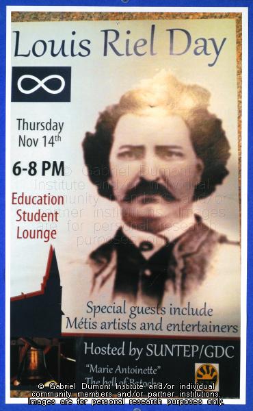 This image is of a Louis Riel Day Poster produced by the Saskatchewan Urban Native Teacher Education Program in Saskatoon in November 2013. This item was donated to the Institute by Dennis and Jean Fisher in 2013. This larger collection, donated in 2011, contains archaeological artifacts taken from the battlefields of the 1885 Resistance as well as Fort Pitt (Saskatchewan), Cumberland House (Saskatchewan) and St. Peter’s Mission, Montana. The collection also includes various artifacts and ephemera relating to the 1885 Resistance and Gabriel Dumont. |
