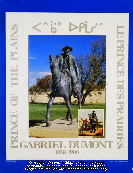 This image is of a Gabriel Dumont statue poster produced in the 1980s. The inset photograph is of sculptor Bill Epp with Dennis and Jean Fisher who are about to take the statue to the Dumont family reunion. Bill Epp made the statue after being commissioned by the Celebrate Saskatoon `85 Committee. This item was donated to the Institute by Dennis and Jean Fisher in 2013. This larger collection, donated in 2011, contains archaeological artifacts taken from the battlefields of the 1885 Resistance as well as Fort Pitt (Saskatchewan), Cumberland House (Saskatchewan) and St. Peter’s Mission, Montana. The collection also includes various artifacts and ephemera relating to the 1885 Resistance and Gabriel Dumont. |