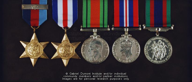 | Description: | This image is of David Henry Carriere's Canadian Army Medals from the Second World War. They are: (L to R) 1939-1945 Star, France and Germany Star, Defence Medal, War Medal 1939-1945, and the Canadian Volunteer Service Medal. These are the standard set of medals for those who volunteered in and fought with the Canadian Army in northwest Europe during the Second World War. According to Victor Demas Carriere, who granted the Gabriel Dumont Institute permission to photograph this image, his father David Henry Carriere was only 17 when he joined the Canadian Army. David enlisted because his older brother Frank had signed up and he did not want is brother to go to war by himself.