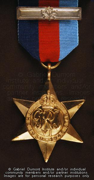 This image is of David Henry Carriere's 1939-1945 Star, which was given to him for serving in the Canadian Army during the Second World War. According to Victor Demas Carriere, who granted the Gabriel Dumont Institute permission to photograph this image, his father David Henry Carriere (1921-1987) was only 17 when he joined the Canadian Army. David enlisted because his older brother Frank had signed up and he did not want is brother to go to war by himself. |