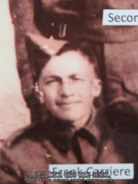 This image is of Frank Carriere, a Métis solider in the Canadian Army during the Second World War, and is a close up of a photograph including David H. Carriere (Frank’s younger brother), August Letendre and Charlie Dubois. According to Victor Demas Carriere, who granted the Gabriel Dumont Institute permission to photograph this image, his father David Henry Carriere was only 17 when he joined the Canadian Army. David enlisted because his older brother Frank had signed up and he did not want is brother to go to war by himself. rnrnThe donators, Victor Demas Carriere and Brenda (Sayese) Carriere hold copyright for these images. They can not be used for any purpose. |
