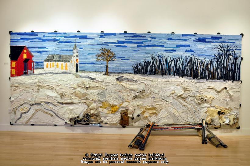 Using recycled hockey gear, Liz Pead creates large-scale installations using the histories of textile, legend, and Canadian landscape painting.  In this piece, Liz captures Batoche, Saskatchewan in the Winter. |