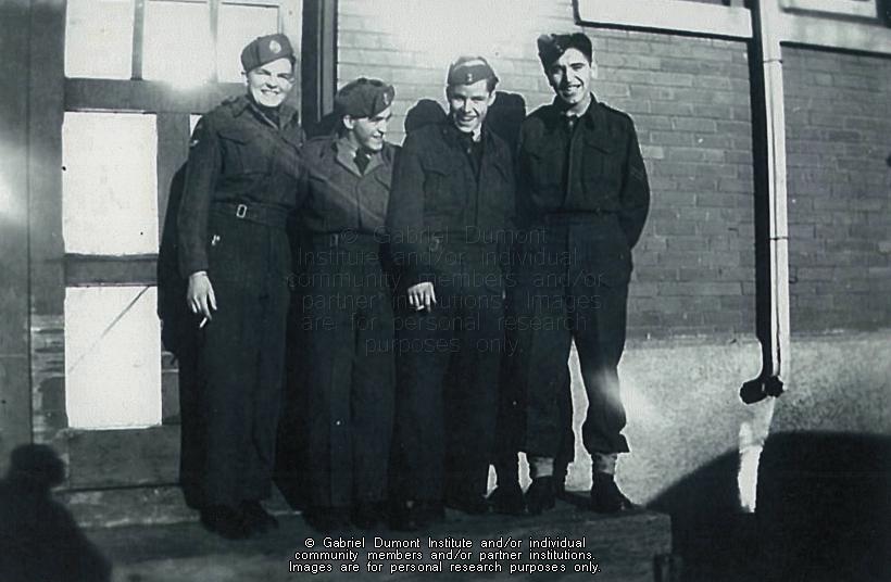 | Description: | This is image is of Harold Lajimodiere (1922-2000) (far right) who served with the Essex Scottish Regiment of the Canadian Army during the Second World War. Three of his fellow service members appear to his immediate left. Originally from the Estevan, Saskatchewan area, his parents were Marceline Blondeau and Albert Lajimodiere. His great-grandparents were Jean-Baptiste Lagimodière and Marie-Anne Gadboury—Louis Riel’s maternal grandparents. Harold Lajimodiere was involved in the organization of Métis veterans in Saskatchewan before he passed away in 2000.