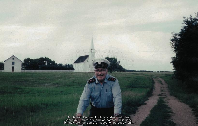 | Description: | This is image is of Harold Lajimodiere (1922-2000) who served with the Essex Scottish Regiment of the Canadian Army during the Second World War. In this image, he is riding a bike at Batoche National Historic Site where he served as a commissionaire. Originally from the Estevan, Saskatchewan area, his parents were Marceline Blondeau and Albert Lajimodiere. His great-grandparents were Jean-Baptiste Lagimodière and Marie-Anne Gadboury—Louis Riel’s maternal grandparents. Harold Lajimodiere was involved in the organization of Métis veterans in Saskatchewan before he passed away in 2000.