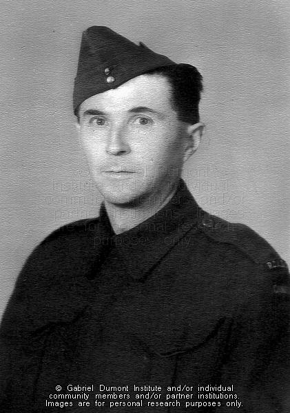 This is an image of Private Edmond Joseph Boyer (1898-1966) who served briefly in both the First and Second World Wars. This photograph is from the Second World War. Edmond was from Batoche, Saskatchewan. This image was donated to the Institute by Brenda (Boyer) Percell. The original source of this image is Estelle Boyer. Edmond was Brenda’s grandfather. This image must not be reproduced. |