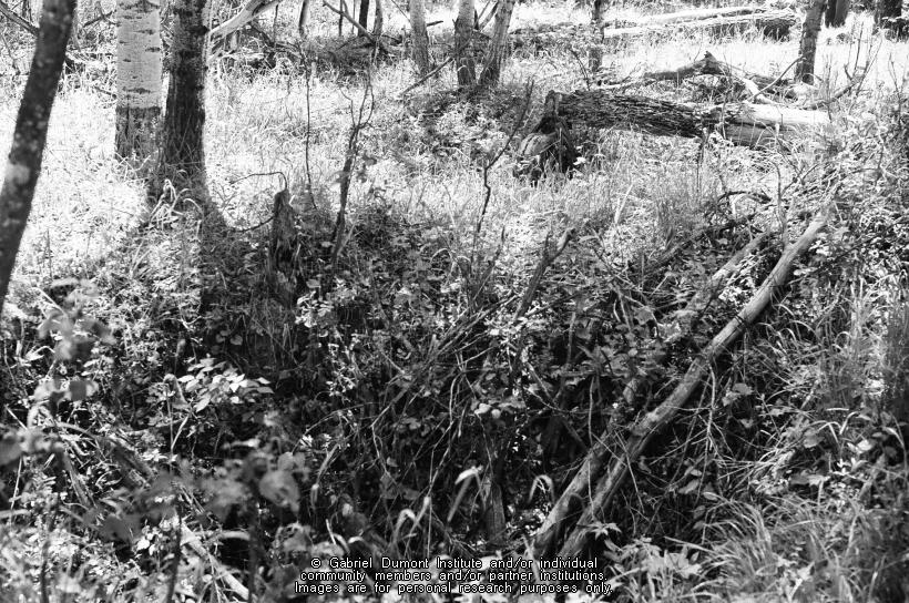 Description: This image is a photograph of the Kajewski site, Métis hivernant (``winterer``) cabins near Elkwater, Alberta. The site is in the Cypress Hills and this particular image was photographed in 1967 by Robson Bonnichsen.