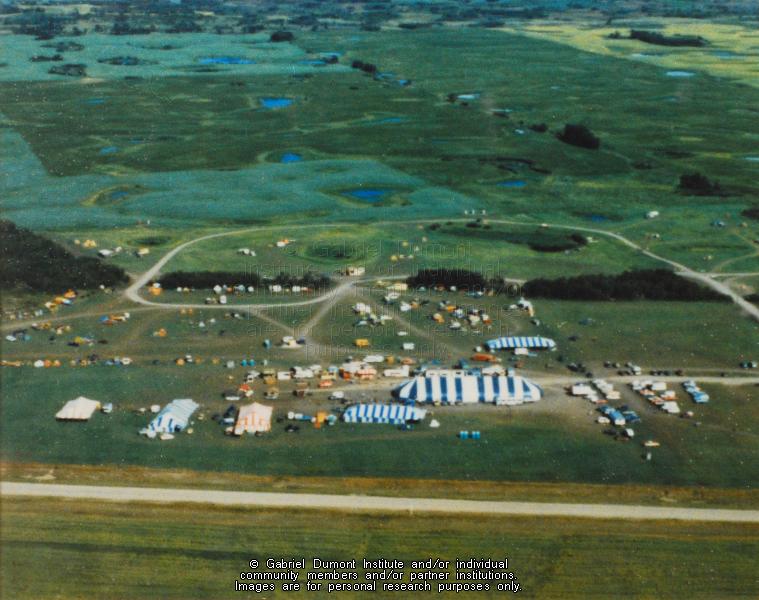 Description: This image is of an aerial photograph of Back to Batoche, likely taken in the 1980s. The original photograph was donated to the Gabriel Dumont Institute Museum by Claude Petit.