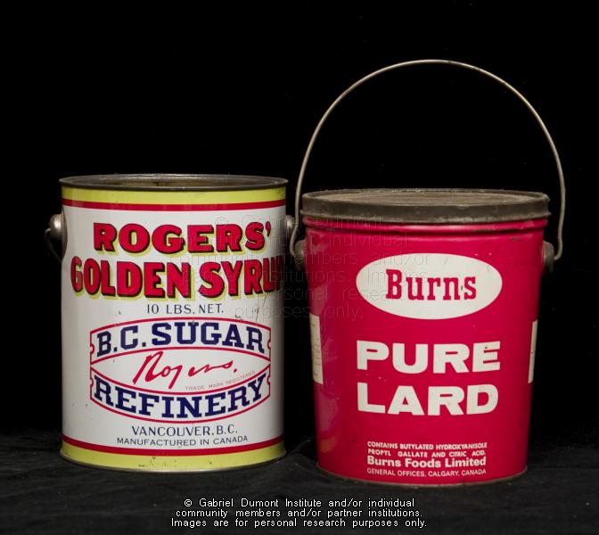 | Description: | This image by Peter Beszterda is of a Roger's Golden Syrup and Burns Lard cans. Many Métis used cans like these as lunch pails. |