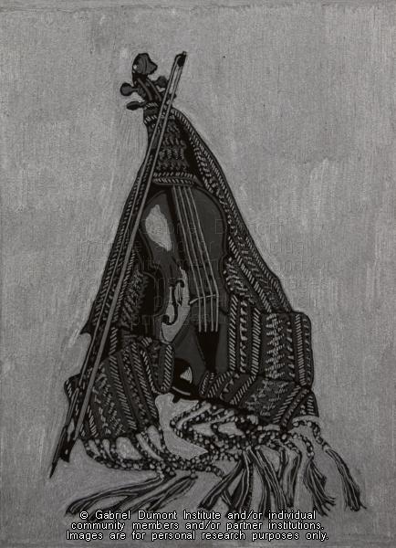 | Description: | This image, taken by Peter Beszterda, is an etching of Garry Natomagan's painting "Heart of the Métis." |