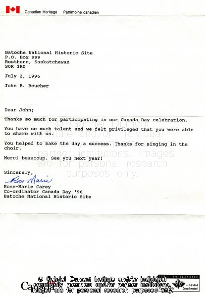 | Title: | Letter, Batoche National Historic Site to John Boucher |