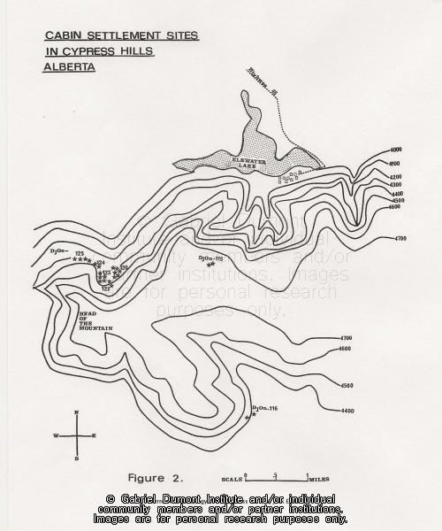 | Description: | This image is a map of the area around the Kajewski Site at the Head of the Mountain, a Métis Hivernant settlement in the Cypress Hills. Jack Elliott`s 1971 MA thesis—``Hivernant Archaeology in the Cypress Hills``—is based on an archaeological reconstruction of Cabins B and E of the Kajewski cabin site near Elkwater Alberta in the Cypress Hills. In this thesis, Jack Eliott analyzes the archaeological reconstruction of two Métis hivernant (``winterer``) cabins in the western half of the Cypress Hills. Hivernant is the French word for ``winterer,`` and in the Métis context refers to those Métis bison hunters and their families who settled during the winter in wooded, sheltered environments on the southern prairies such as the Cypress Hills, Wood Mountain, and Willow Bunch. These locales offered shelter from fierce prairie winters and provided game, wood, and fresh water. At the Kajewski site, Jack noticed that in the bison processing pits and in other areas of the cabin floors, there was a mixture of Euro-Canadian/American iron tools and older, Pre-Contact-style First Nation’s stone tools. At the time, archaeologists were puzzled by this mixture of tool cultures at the site and within its stratigraphy (the layer of sedimentation at an archaeological site), suggesting that the Métis at these wintering sites used the ``old`` and ``new`` tools interchangeably. Archaeologists thought it curious that the Métis hivernants willingly used stone tools when ``better`` iron tools were available to scrap bison hides and cut meat. Jack argued that the Métis used both tool types while his colleagues thought otherwise. This debate has continued to this day.